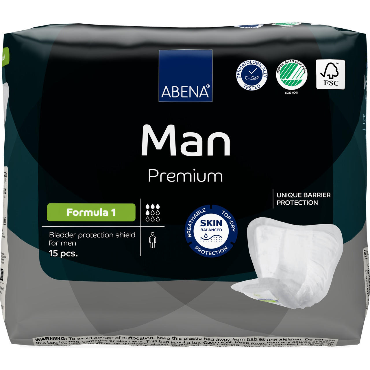 Abena-Man Formula provides ultimate protection against leakage through unique, pocket shaped, comfortable lengthwise barriers. The product ensures optimum comfort and security due to the special shape adapted to the male anatomy. Micro punctured top sheet, channel systems and frontal double Top Dry layer provides fast dispersion of the liquid and a dry surface next to the skin. The breathable Air Plus backing is soft and discreet, allowing the skin to breathe, reducing the risk of skin problems. Secure fixation is ensured by the self-adhesive strip, which can be positioned excellently in close-fitting underwear.