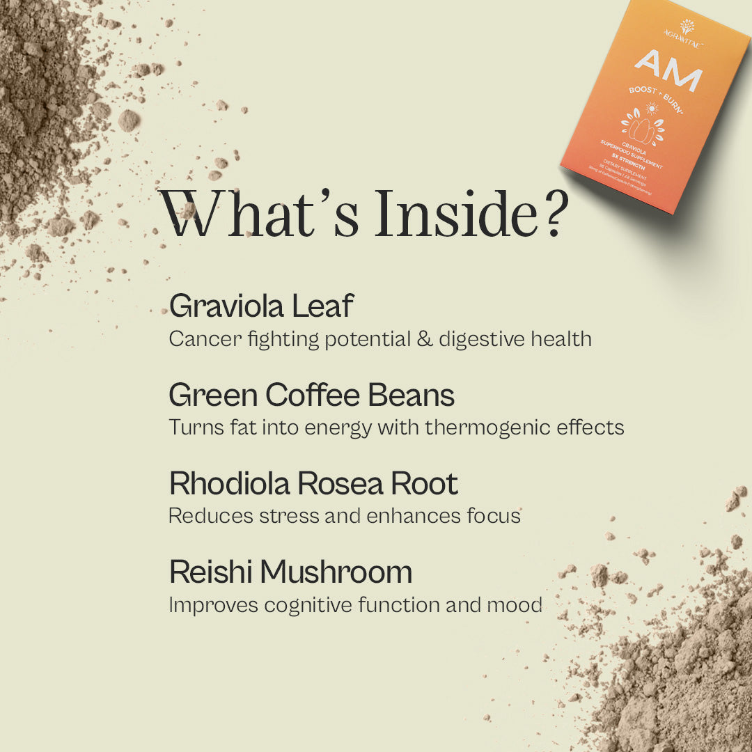 AM Boost + Burn features a synergistic blend of ingredients that have been used traditionally and proven to help support fat burning and weight management, including several botanicals, mushrooms and so much more.