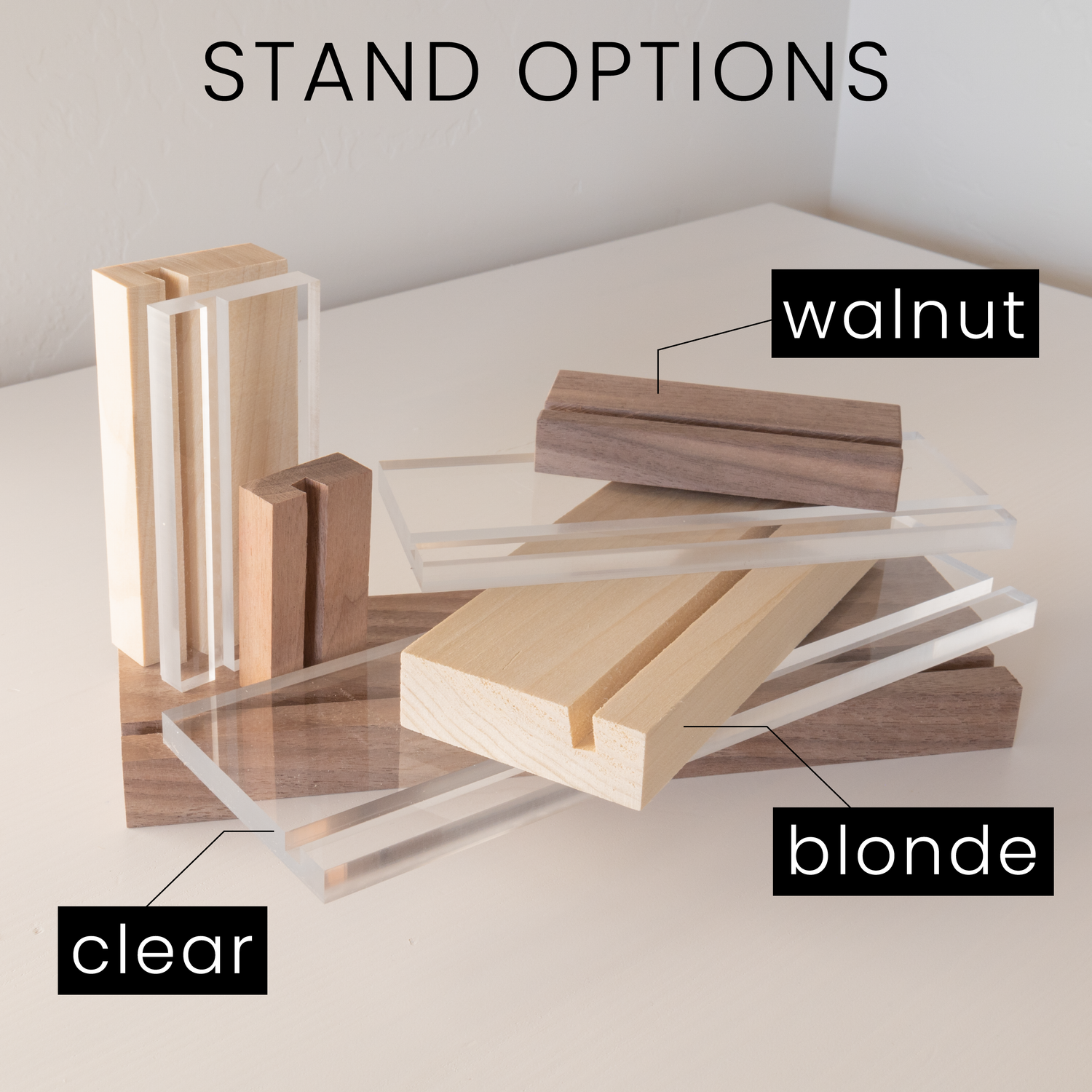 - Wood Stand: Blonde is Solid Oak Wood and Walnut is Walnut