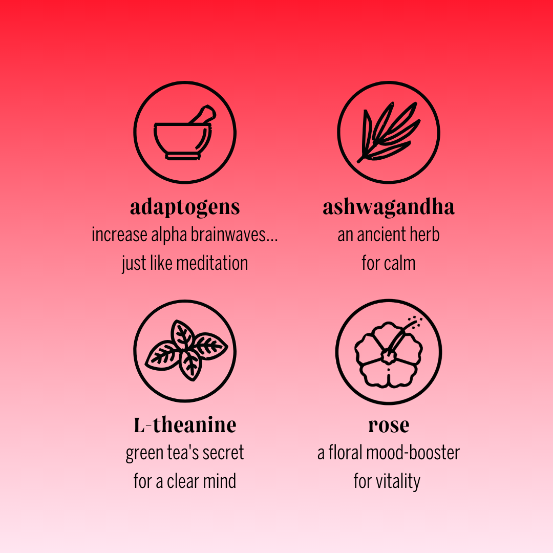 - Adaptogens such as L-theanine, ashwagandha, chaga, and ginseng