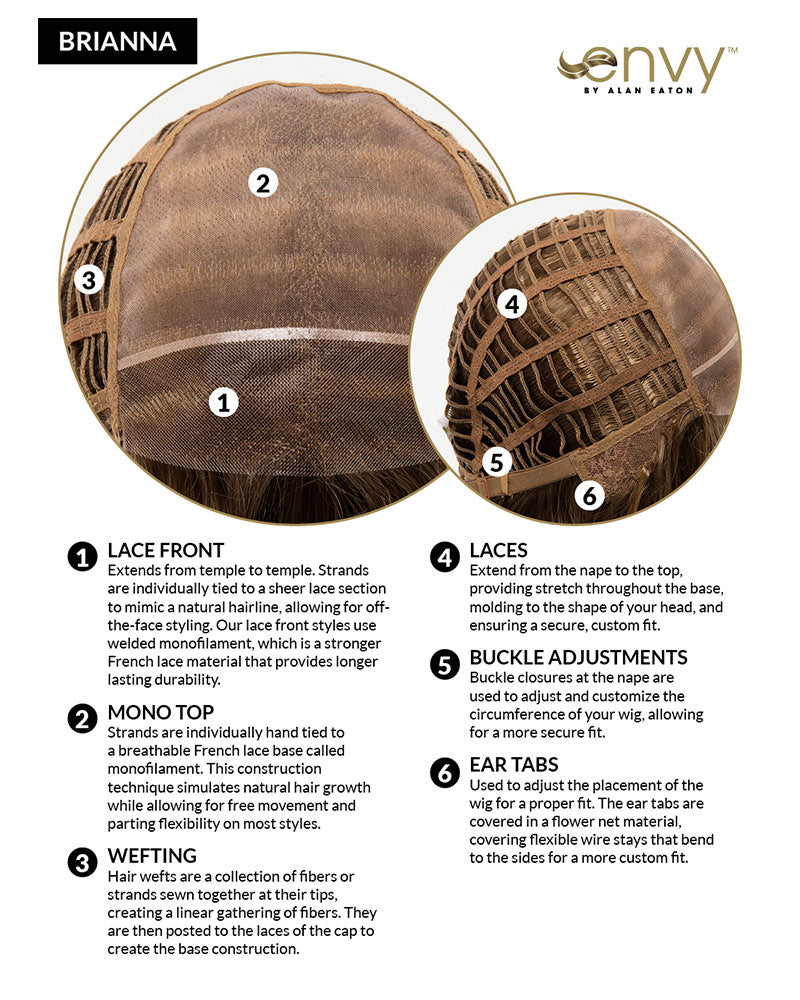 A Monofilament Top gives the appearance of natural hair growth from the scalp which adds to the natural look and believability of Brianna.