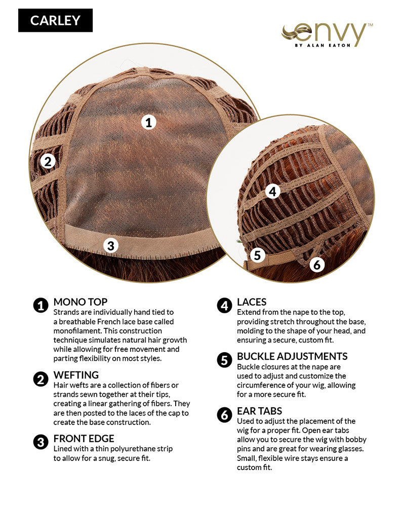 Carley by Envy creates a new presentation to a timeless style. The soft face framing layers and wispy bangs makes this style as easy fit straight from the box. Minimal styling is required, just comb this lightweight style in place and you are ready to impress. Mono top construction offers the latest in hand-tied features making this style an easy casual fit for most wearers.