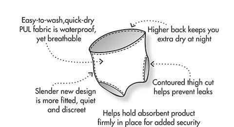 Heavy-duty waist and leg elastics hold leaks in yet are enclosed in the same PUL material to keep you comfortable. A high back design keeps you extra dry at night while the contoured thighs prevent leaks from the leg openings.
