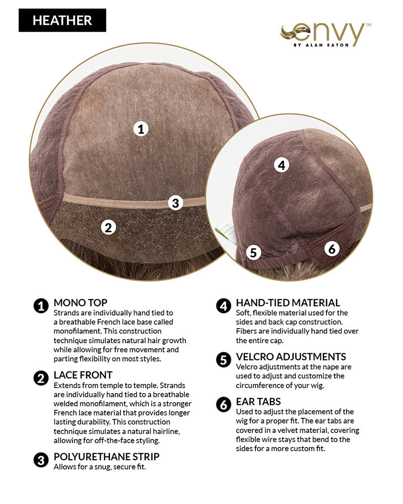 Envy hair behaves naturally while maintaining the feel and texture of human hair. Heather is constructed with mono top, lace front and Hand-Tied Sides and back.