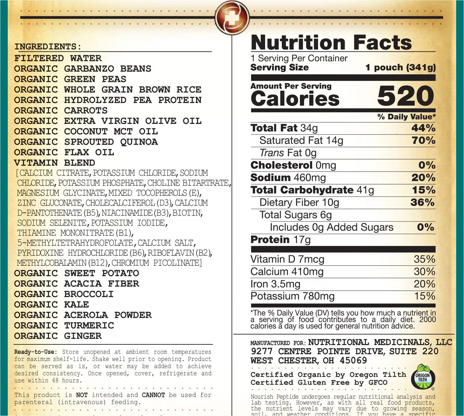 Nourish Peptide is the first organic, whole-food, plant-based peptide formula designed for children as both a feeding tube formula and meal replacement. Crafted from the original Nourish formula, it includes organic hydrolyzed pea protein and organic coconut MCT oil for added benefits. Each serving provides 520 calories from 16 Certified Organic, plant-based ingredients, promoting enhanced digestion and maximum nourishment.