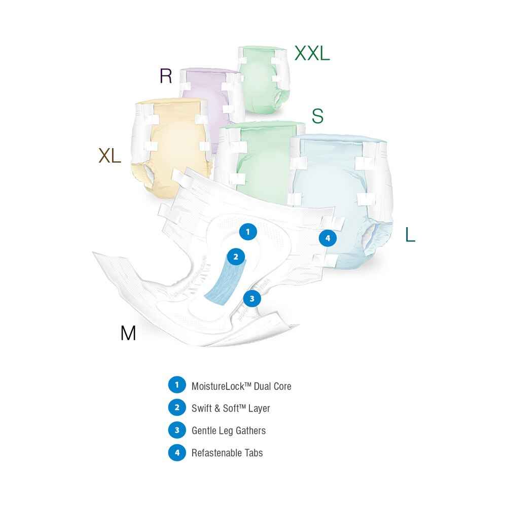 • Swift & Soft™ layer prevents leaks and keeps the skin totally dry by rapidly channeling liquid directly into the absorbent core.