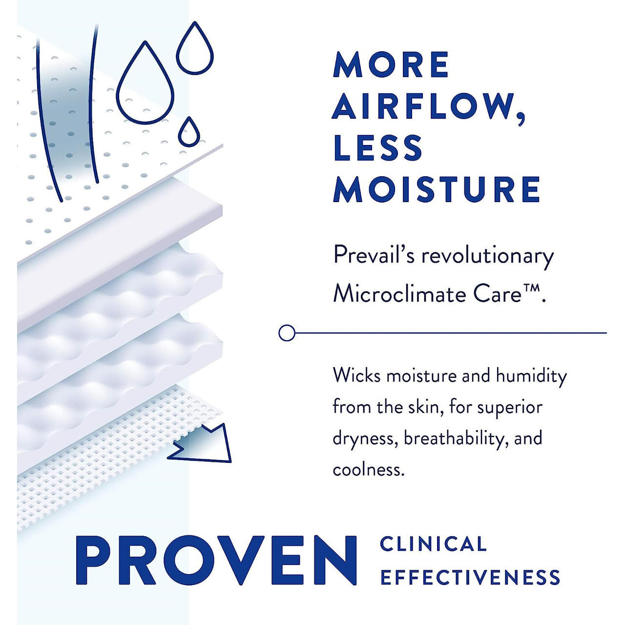 Prevail Air Briefs offer maximum protection, comfort and breathability. They have maximum plus absorbency, which is ideal for heavy bladder leakage. The Prevail® Microclimate Care™ system creates a favorable microclimate by incorporating performance features to help maintain normal skin temperature and moisture at the skin surface, which supports healthy skin. Microclimate Care™ features includes: 1) 360° Breathable Zones™ allow air to circulate around the entire brief and help prevent heat and moisture build up, 2) Doublesorb™ Layers lock up moisture, and 3) QUICK WICK® with MaxSoft™ and a fast absorbing thin core rapidly lock away moisture and odor. Other features include: 1) Expandex™ Wings offer a discreet, customized fit, 2) Easy-Lock Fastener® Strips grip and hold without being sticky, 3) Direct Lock™ Panels offer an adjustable fit, 4) Odor Guard® stops odors before they start, 5) Outer Fabric is soft and comfortable, and 6) our Dri-Fit™ system provides a new level of protection and skin comfort to help maintain healthy skin.