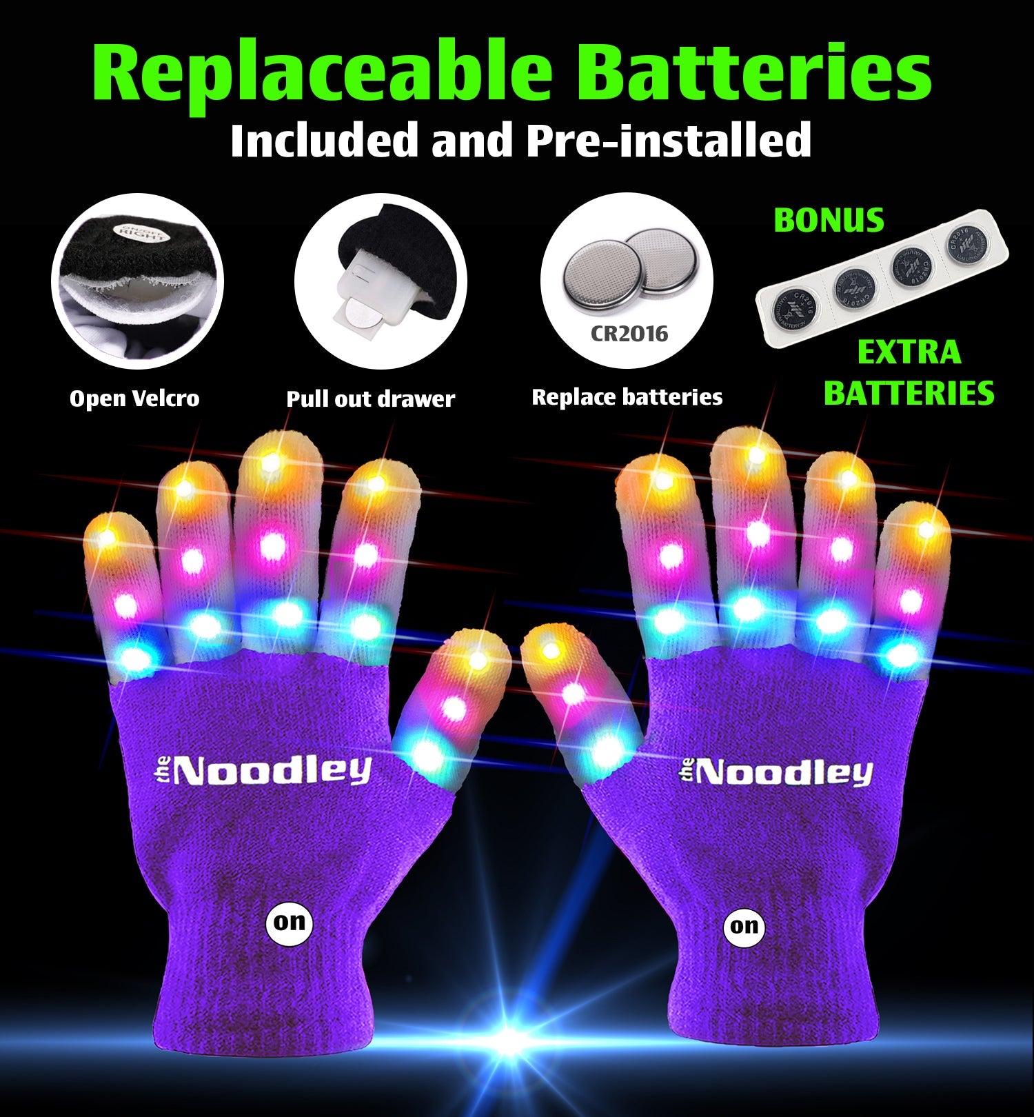 - Gloves require (4) CR2016 batteries; Hat requires (2) CR2016 batteries; Shoelaces require (2) CR2032 batteries. Extra batteries included!