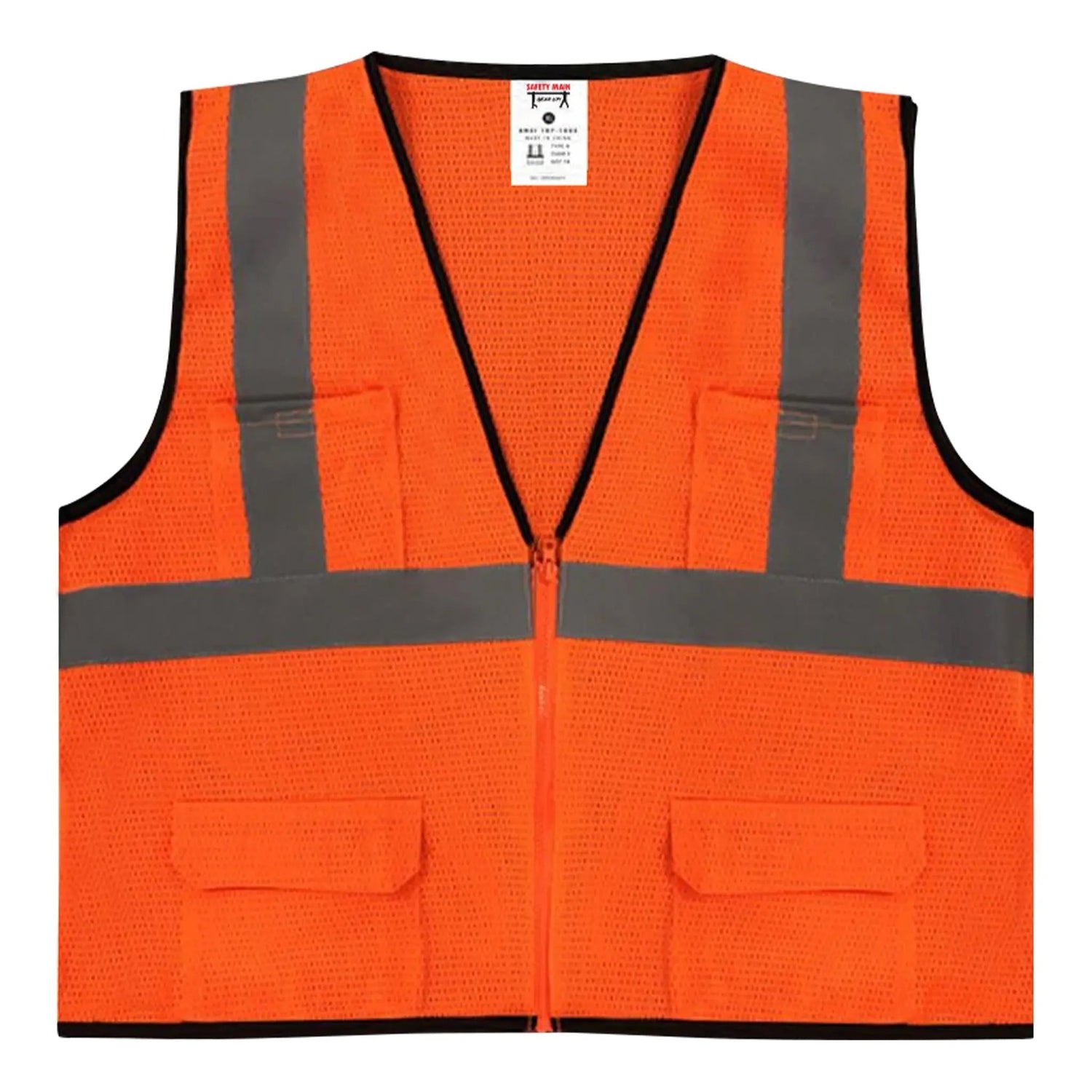 The Safety Main 05EAMO Economy Vest, Class 2, All Mesh, Hi-Vis Orange is a lightweight, breathable safety vest designed to enhance visibility and comfort in demanding work environments. Featuring a durable polyester mesh construction, two breast pockets, a half-length zipper closure, and reflective striping on the chest, shoulders, and back, this vest ensures high visibility even in low-light conditions. Ideal for construction sites, roadwork, and other high-traffic areas, it helps keep workers safe while allowing for easy movement and airflow. This vest meets ANSI/ISEA 107-2015 Type R Class 2 standards, ensuring compliance with industry safety regulations. Available in Hi-Vis Orange, in Medium to 5X-Large Sizes, and in Pack of 3.