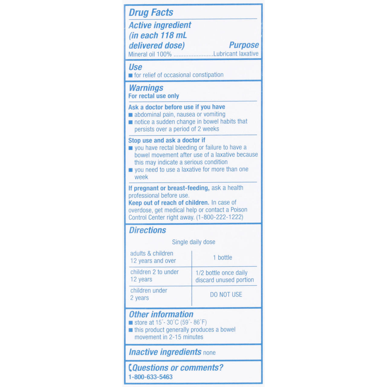 Always follow directions for use. Consult your doctor if you have any questions regarding whether you should rely on a mineral oil enema. Discontinue use immediately if you feel pain or discomfort or if you encounter rectal bleeding.