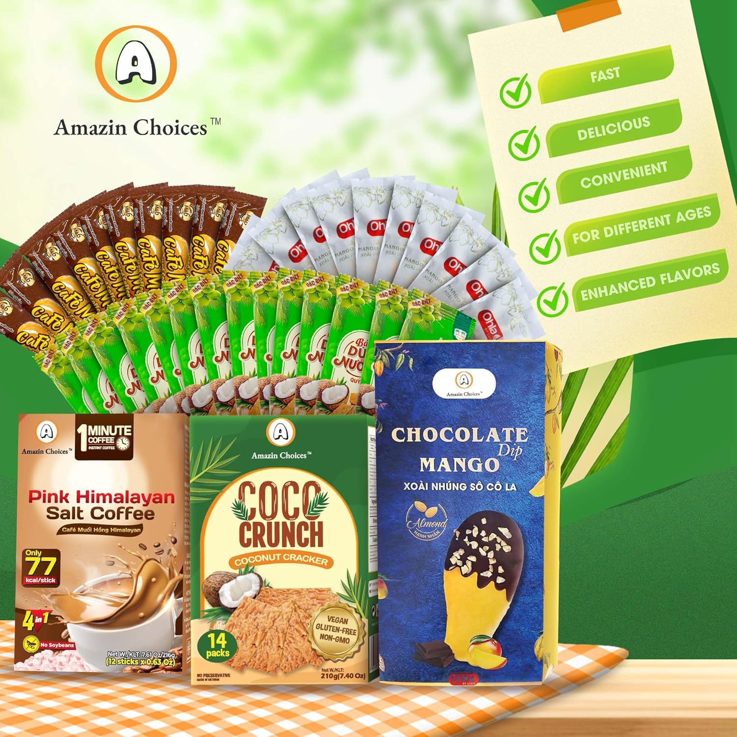 - Delicious & Diverse Asian Snack Bundle – Enjoy a handpicked selection of Vietnamese snacks, including Chocolate Dipped Mango, COCO Crunch Coconut Crackers, and Himalayan Pink Salted Coffee, offering a mix of sweet, crunchy, and bold flavors in one convenient pack.