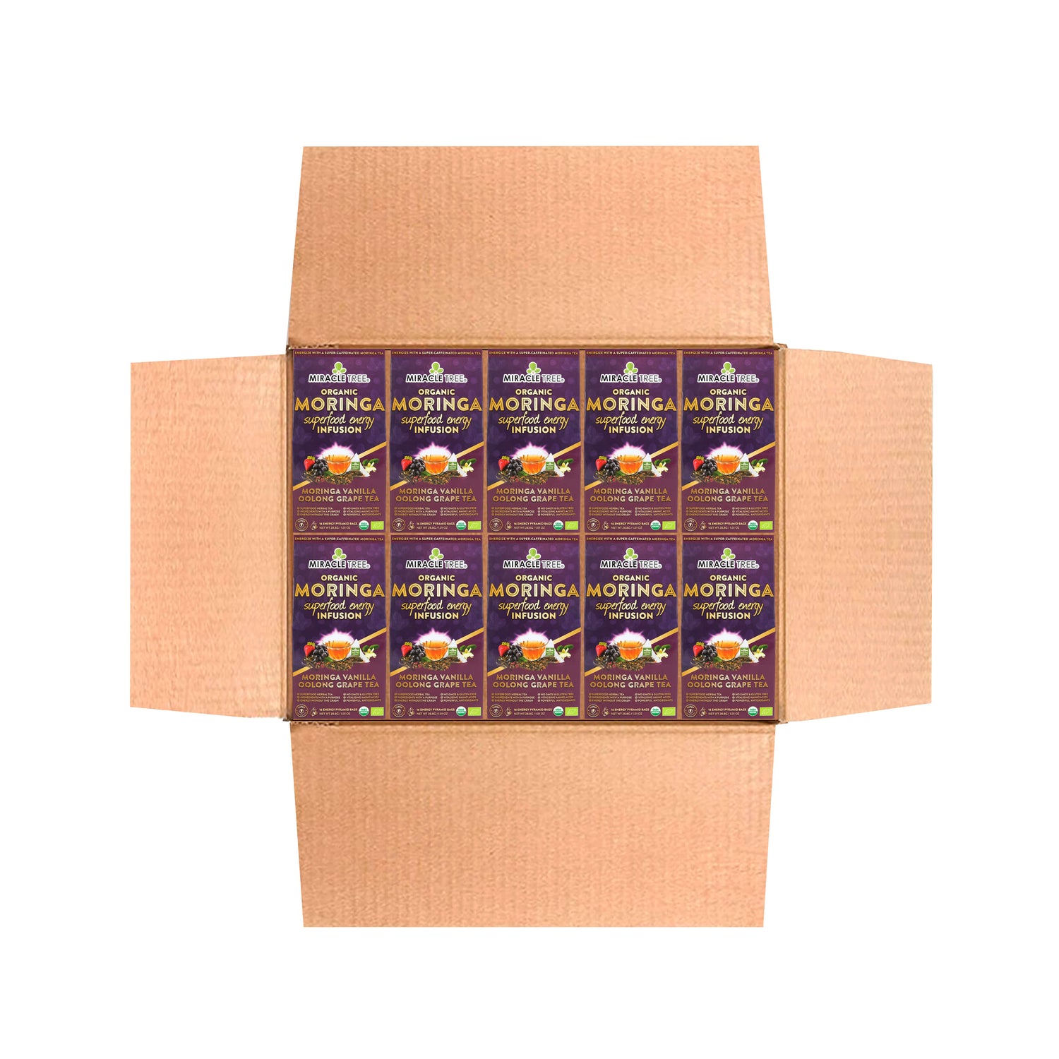 GOODBYE COFFEE, HELLO MORINGA! Supercharge your day with Miracle Tree's organic moringa superfood energy infusions. Indulge in a perfect harmony of oolong tea and moringa leaves with a delicate yet bold addition of organic grapes and organic vanilla.