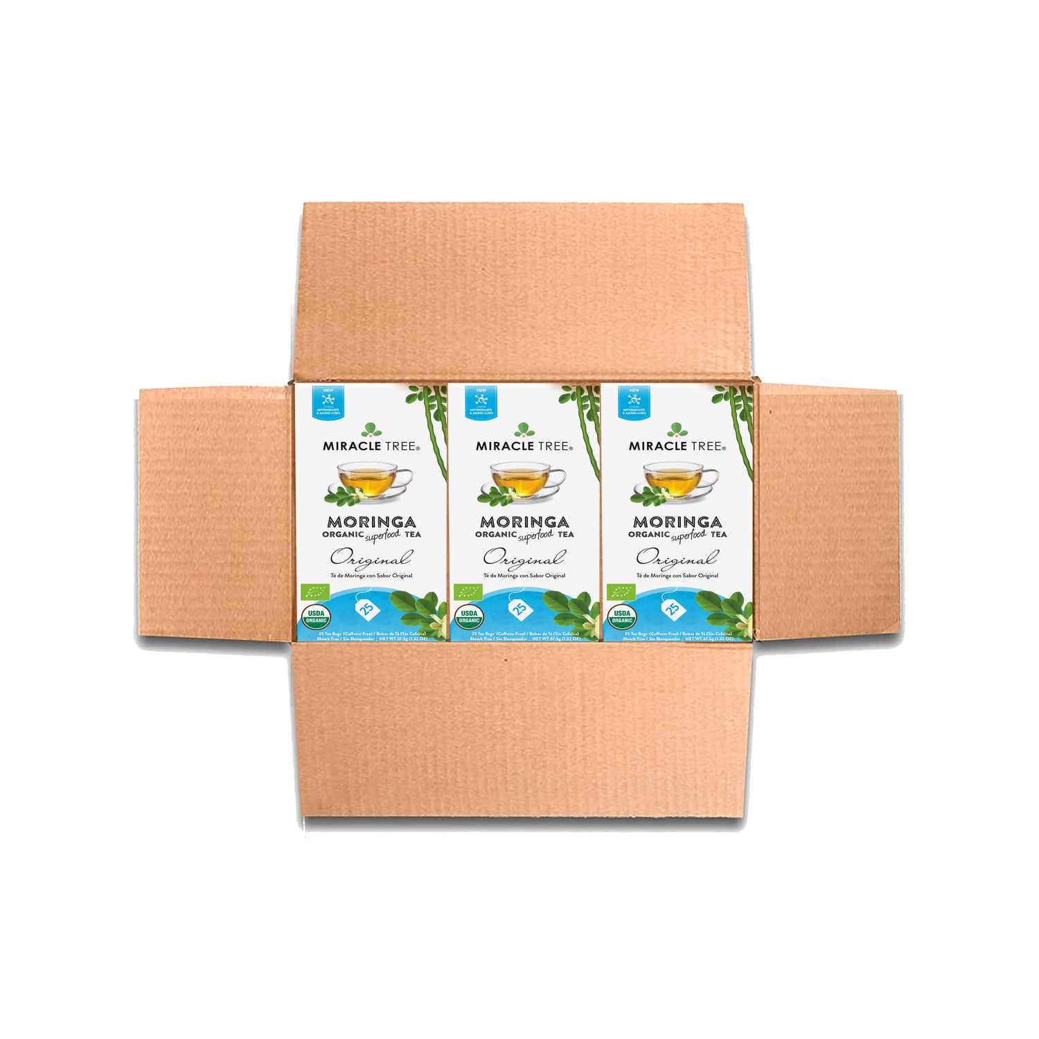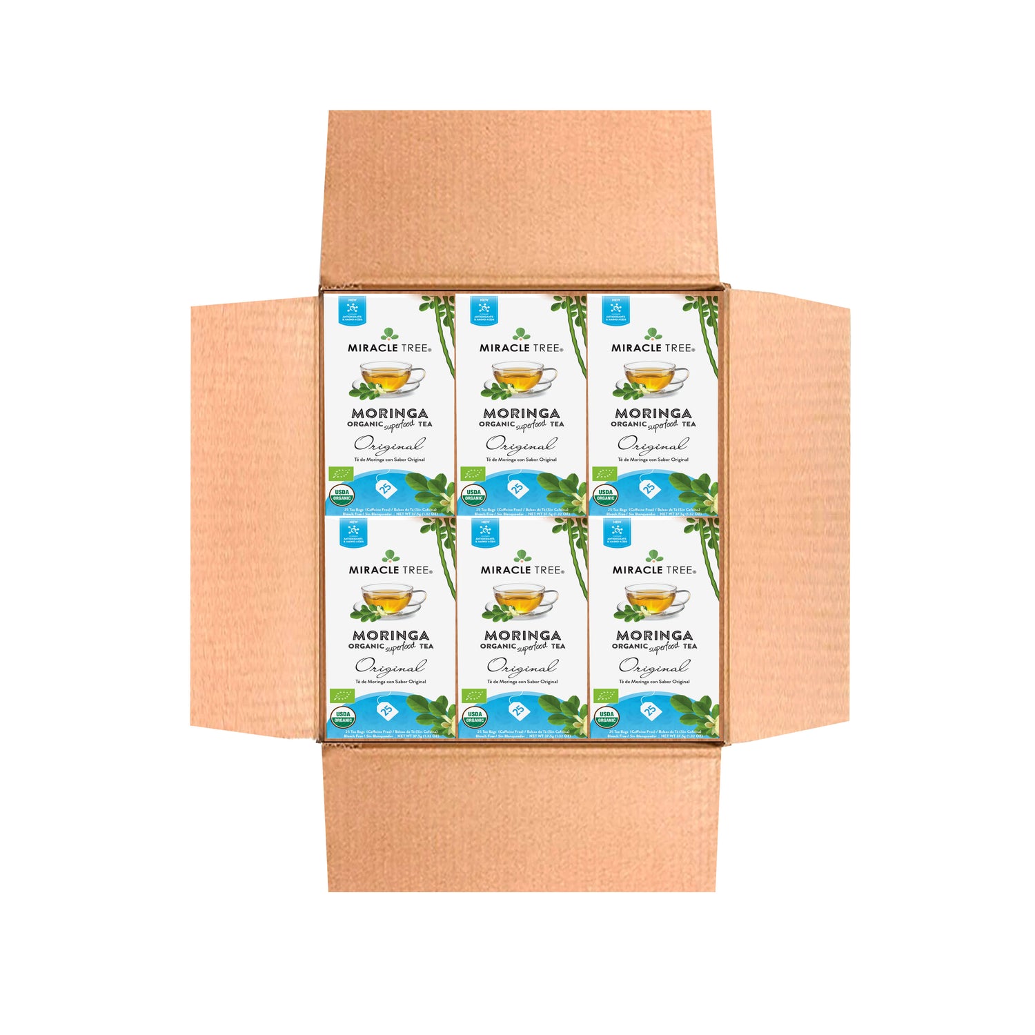 25 WRAPPED TEA BAGS, ORGANIC MORINGA LEAF, NON-GMO, CAFFEINE-FREE, & ABSOLUTELY DELICIOUS. ORGANIC MORINGA TEA, ORIGINAL: Miracle Tree's Original Moringa Superfood Tea is a flavorful infusion, stocked with fresh and Organic Moringa dried leaves; this is our 2015 Great Taste winner, with expert judges concluding that our tea has a “very clean finish, which invites another sip!”