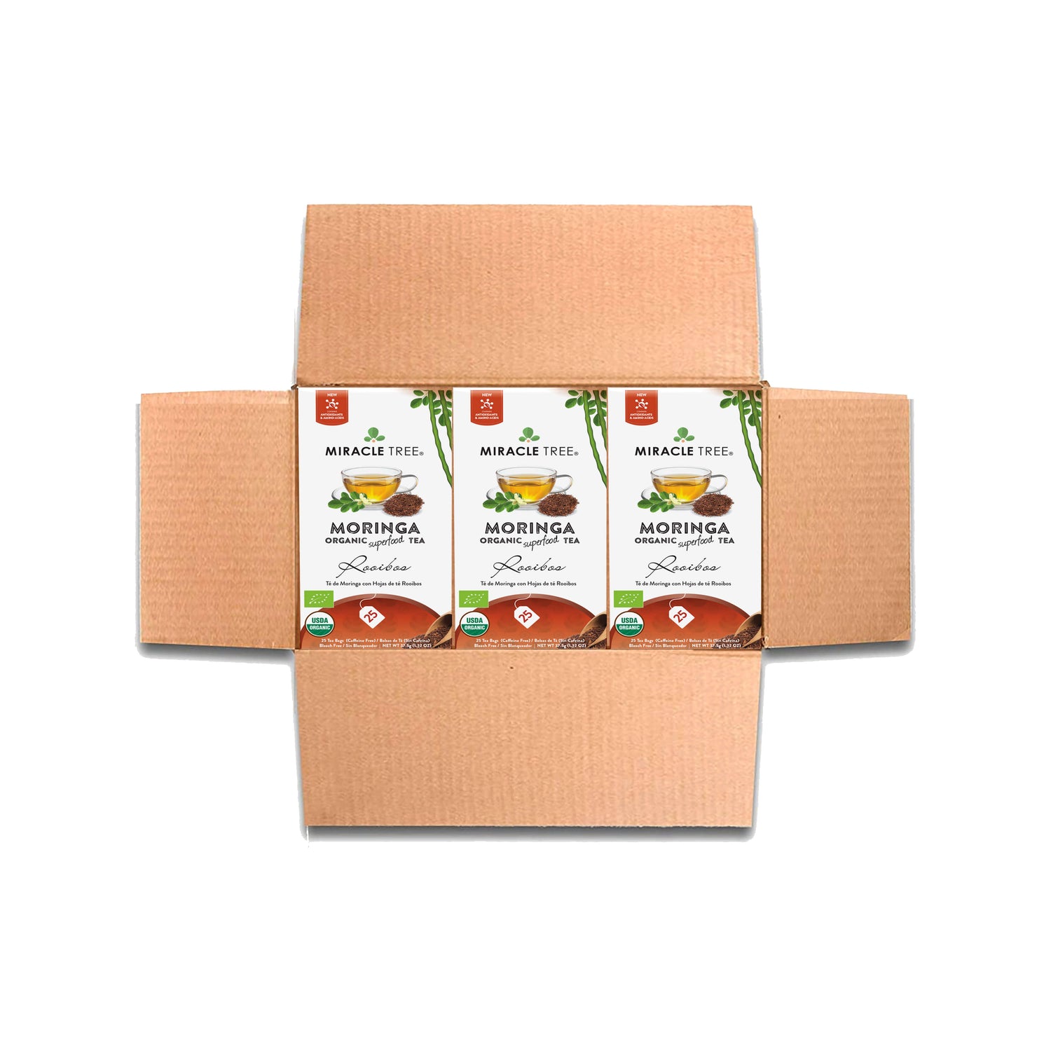 25 WRAPPED TEA BAGS, ORGANIC MORINGA LEAF, NON-GMO, CAFFEINE-FREE, & ABSOLUTELY DELICIOUS. ORGANIC MORINGA TEA, ROOIBOS: This flavorful blend combines the rich rooibos and superfood moringa leaves to create a smooth infusion that is sweet, mild and smooth with a refreshingly herbal texture.