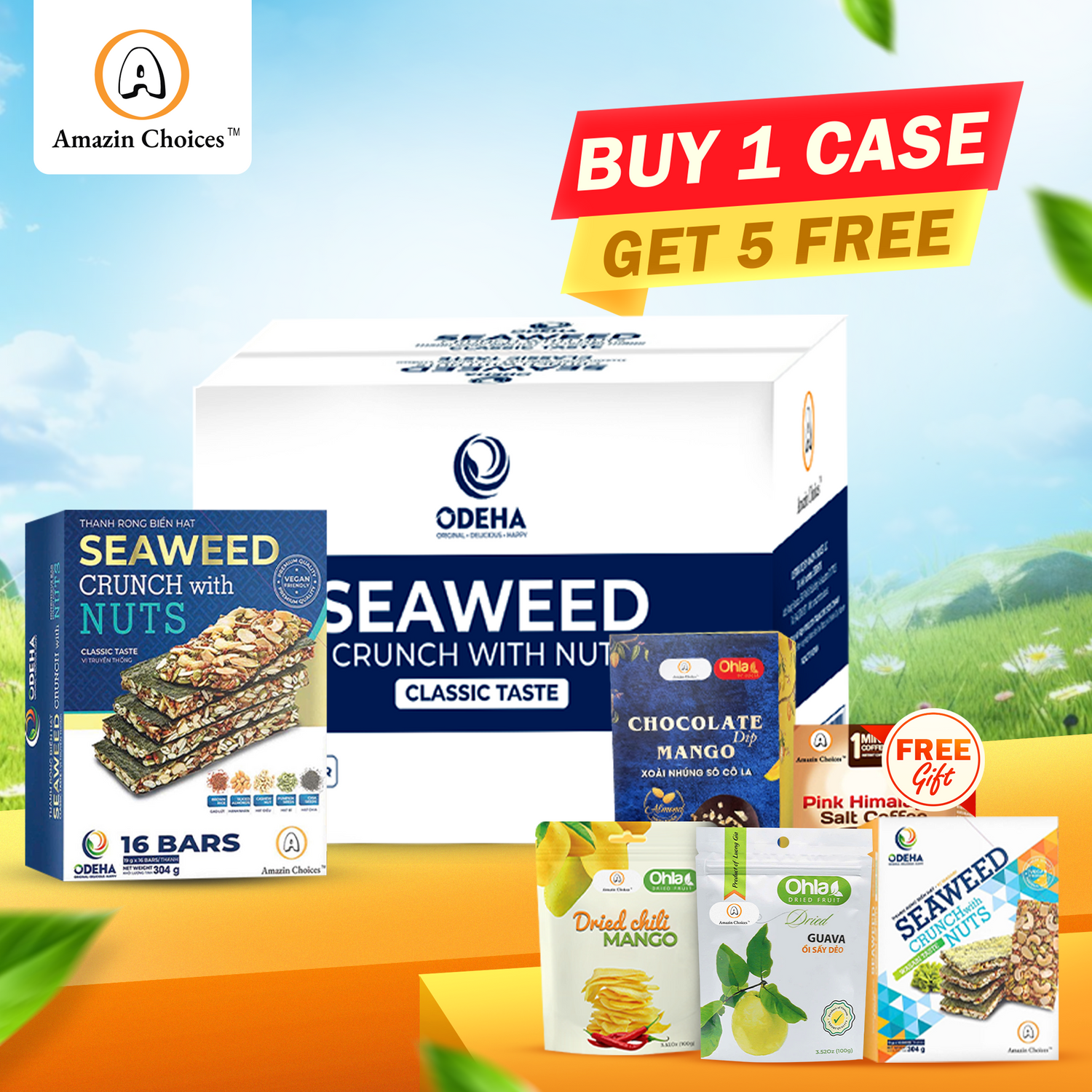 BIG DEAL! Buy 1 Case Seaweed Crunch with Nuts (24 Boxes, 16 Bars Each) – Original Price $479.76 → Now $384 (20% OFF) + FREE Viet Snack Gift Set ($95 Value: Dried Guava, Chili Mango, Wasabi Seaweed, Pink Salt Coffee, Chocolate Dip Mango)