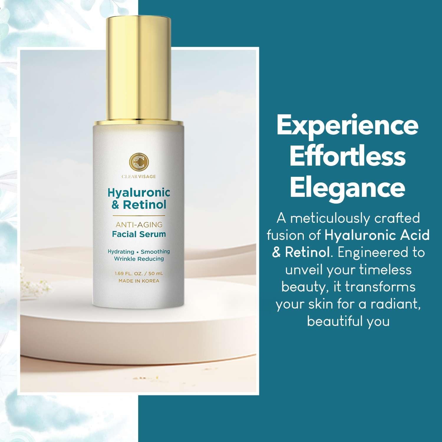 - EXPERIENCE LUXURY KOREAN SKIN CARE – Clear Visage Hyaluronic Acid & Retinol Serum brings you the best of Korean beauty, combining powerful anti-aging ingredients in a beautifully designed, elegant bottle that looks stunning on your vanity. Feel the difference of premium skincare made with care.