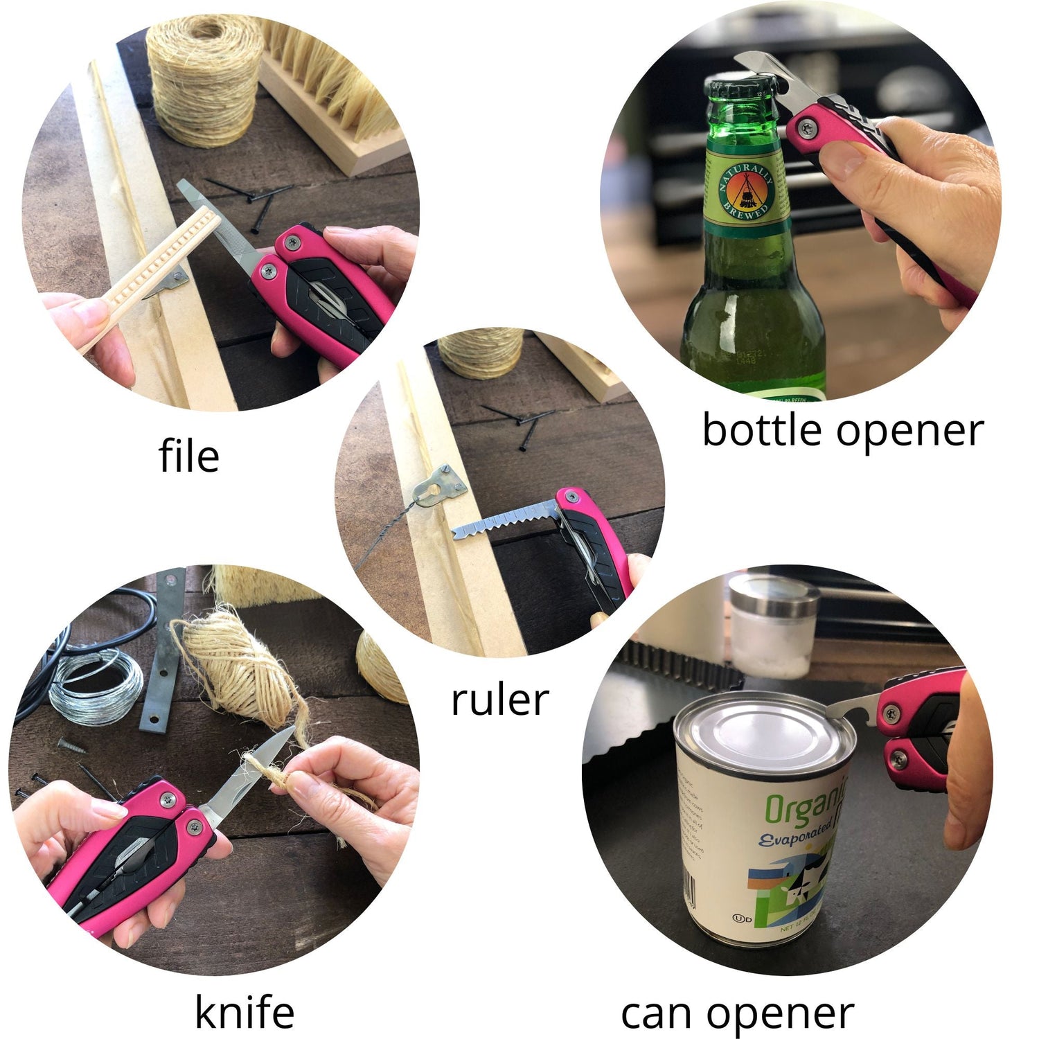 High-quality 14-in-1 pink pocket multitool includes pliers, ruler, knife, can opener, screwdriver, and more. Endless uses for outdoor activities, daily maintenance, and on the job
