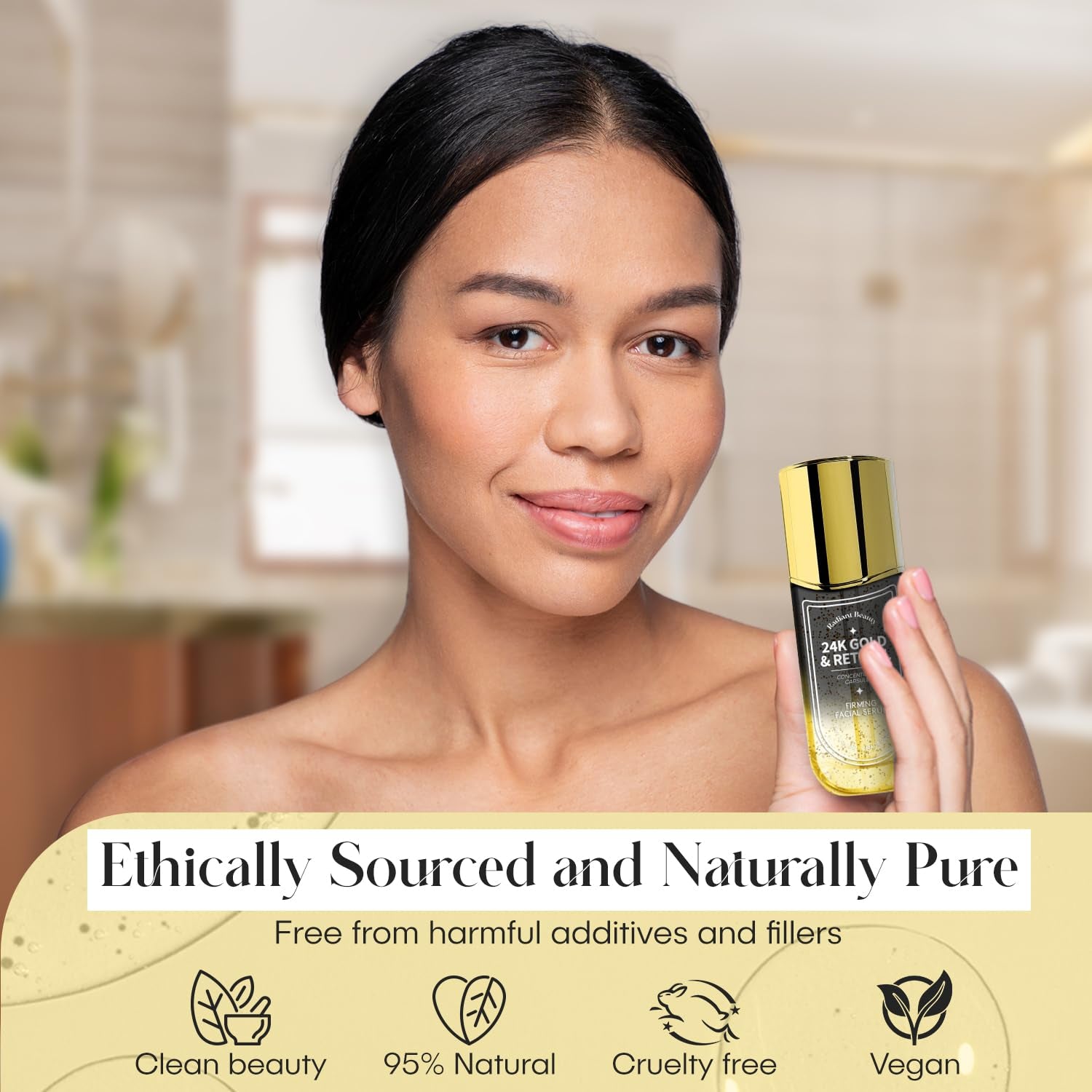 • NATURAL CLEAN INGREDIENTS: Our serum is crafted with clean, natural ingredients, free from parabens, phthalates, and GMOs. Enriched with 24K Gold and Retinol, it promotes cell turnover and combats signs of aging while ensuring a hypoallergenic formula.