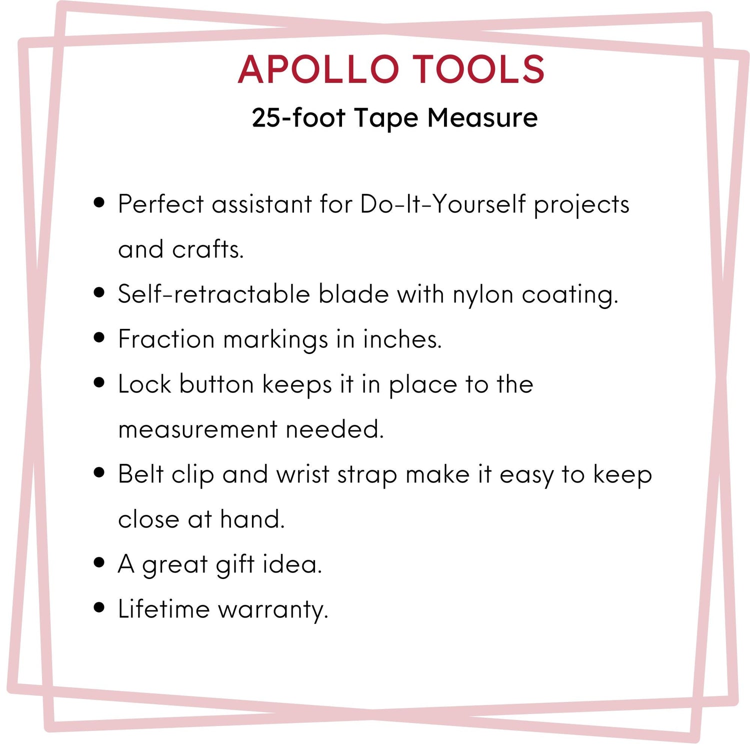 APOLLO TOOLS LIFETIME WARRANTY. We carefully designed this retractable tape measure to last a lifetime and have backed it up with a lifetime warranty. Click on this link to register your Apollo Tools product.