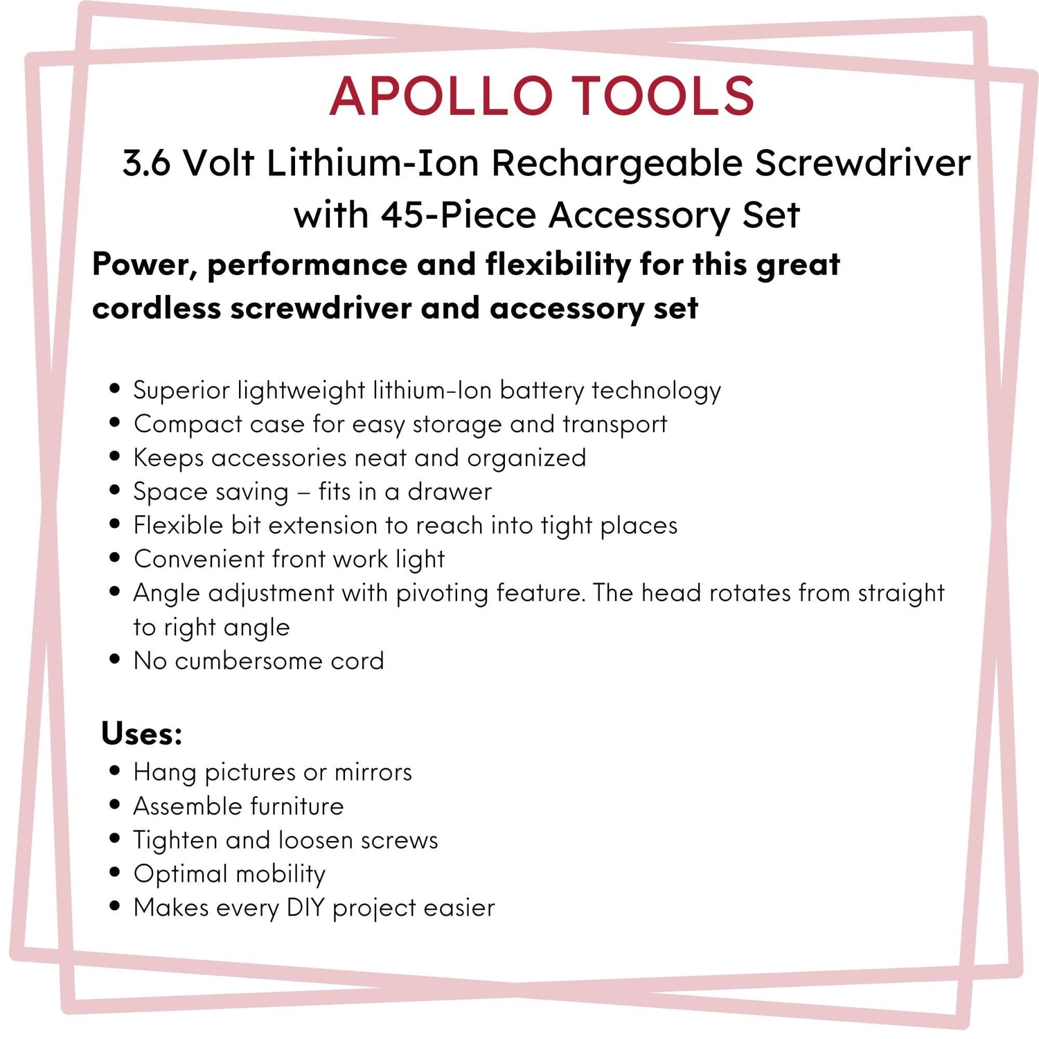 - 3.6 Volt Lithium-Ion Rechargeable Screwdriver with UL-Approved Charger. (replacement manual upon request at support@apollotools.com)