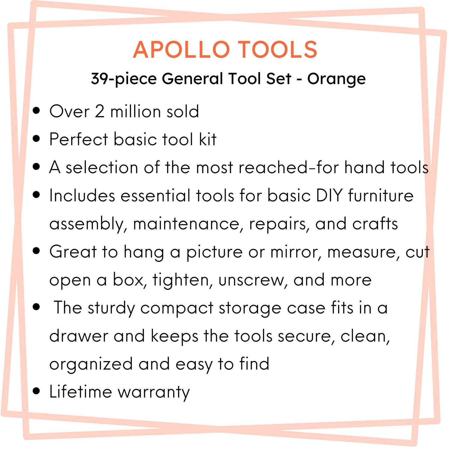 APOLLO HAND TOOL LIFETIME WARRANTY: Tools are manufactured from high-grade steel alloy, chrome plated to resist corrosion, with non-slip comfort grip handles for extra torque, and will last a lifetime under normal use. Click on this link to register your Apollo Tools product.