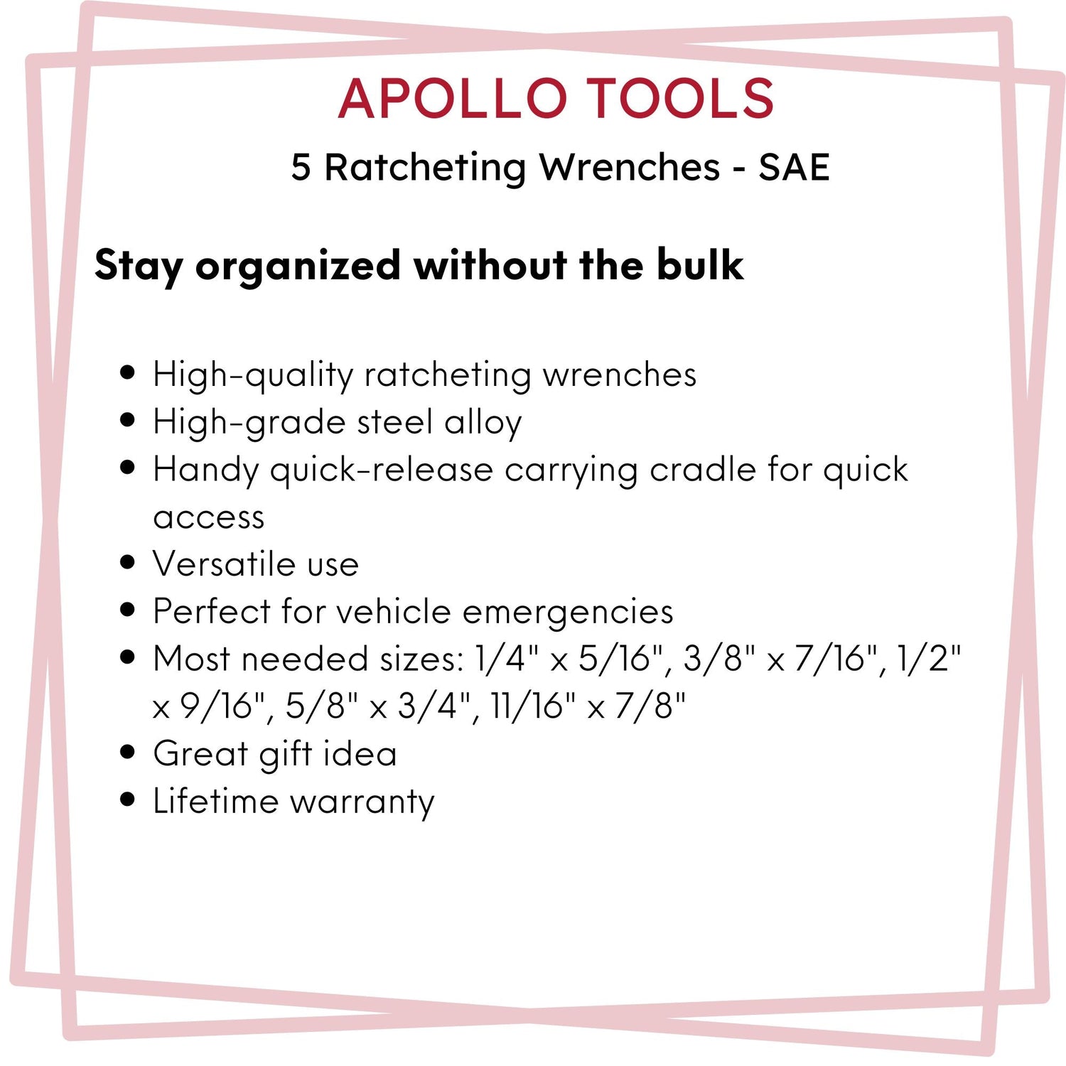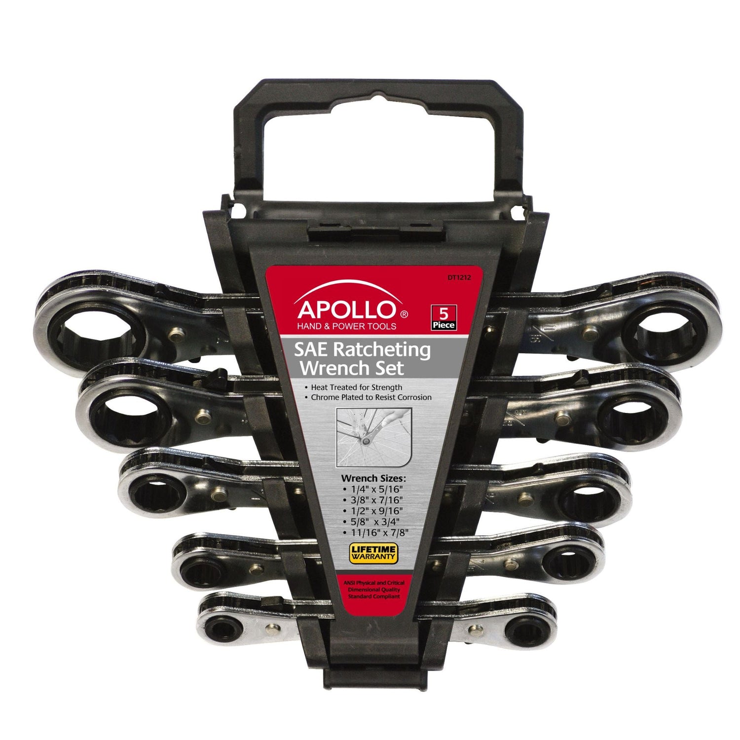 APOLLO TOOLS 5 PIECE RATCHETING WRENCH SET- SAE: This is the set you need and want for SAE applications. Our ratcheting wrenches are made of high-grade steel alloy that is heat-treated for strength and durability and chrome plated to resist corrosion.