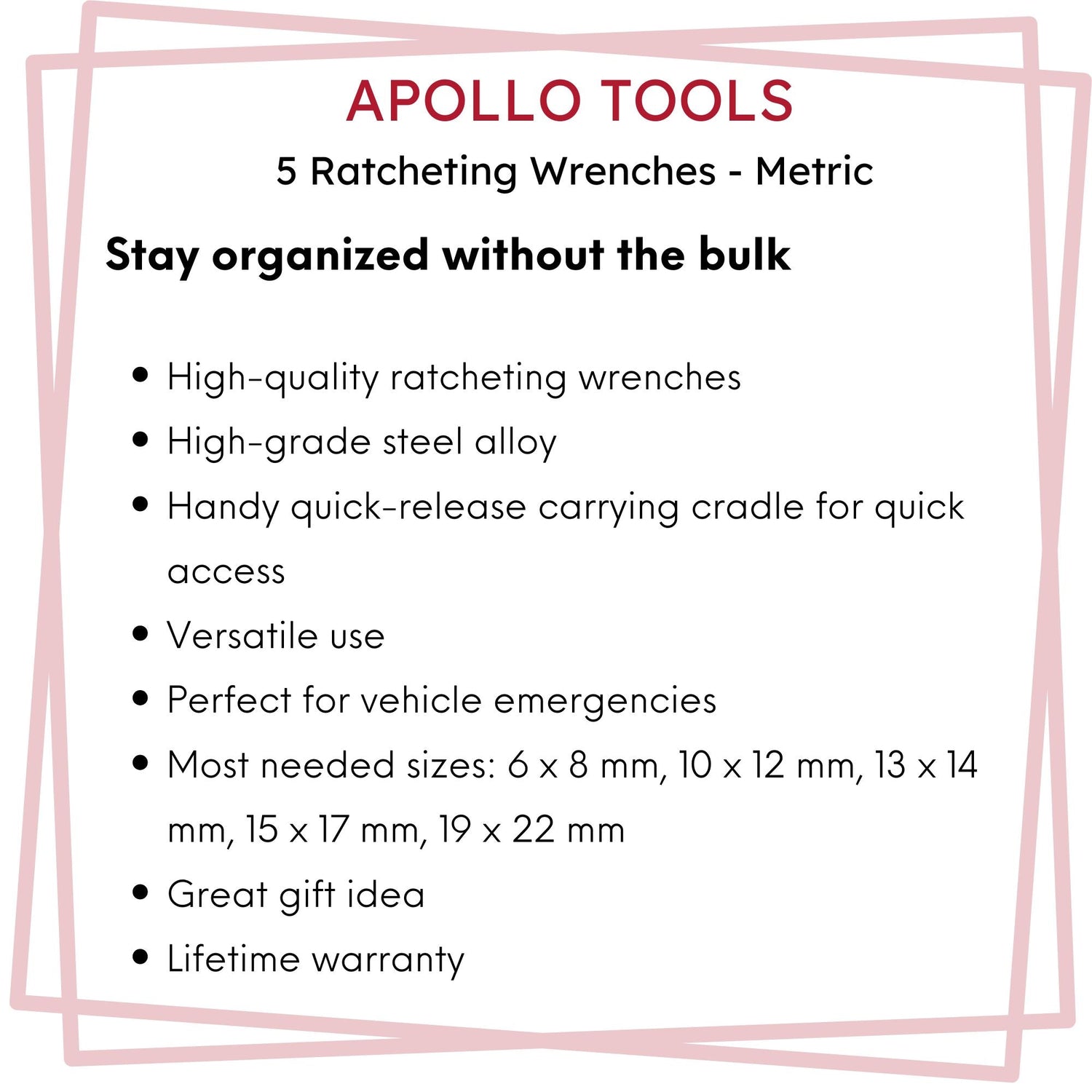 MOST NEEDED SIZES: We selected the sizes we believe you will need most often: 6x8mm, 10x12mm, 13x14mm, 15x17mm, 19x22mm ratcheting wrenches.