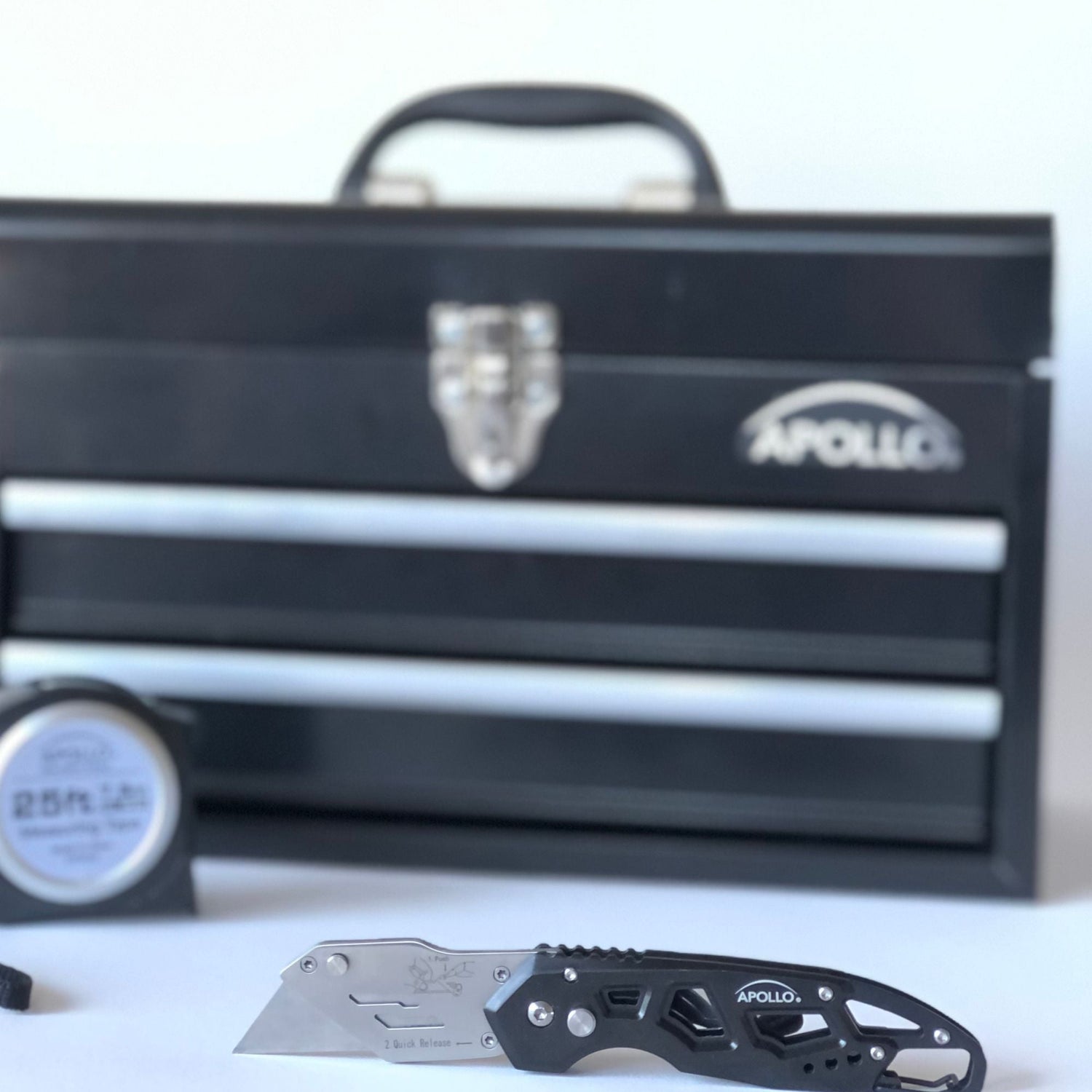 Steel Construction with Light-Weight Frame. Our new black foldable utility knife combines strength and durability with multi-use. Sleek, ergonomic, light-weight, the knife features an easy blade switch mechanism, a carabiner clip and a hook. It comes in an attractive metallic black and with Apollo Tools’ lifetime warranty. Click on this link to register your Apollo Tools product.