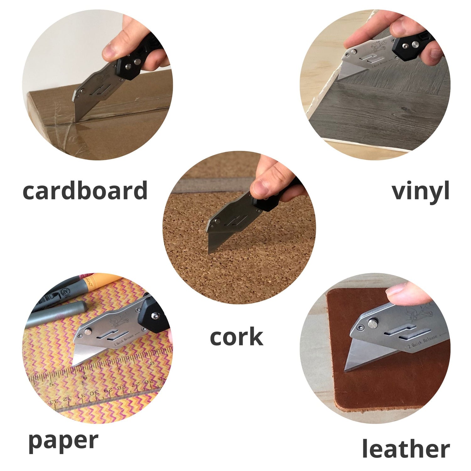 Easily Slices Through Everyday Tasks. No matter the size, this is the right tool for the job: cut cardboard, leather, carpeting, drywall, rope, etc. Once folded, the self-locking mechanism works as a safety feature, making it virtually impossible for it to open on its own.