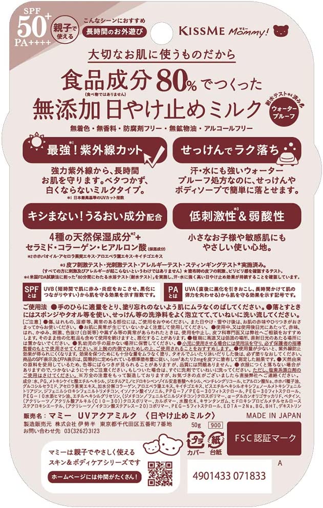 Isehan Kiss Me Mommy UV Aqua Milk sunscreen is a water-proof and moisturizing sunscreen suitable for kids. Made with 80% natural ingredients including raspberry, aloe, and jojoba oil, the sunscreen is free from alcohol and fragrances, making it a gentle product that can be used on the most sensitive and delicate skins.