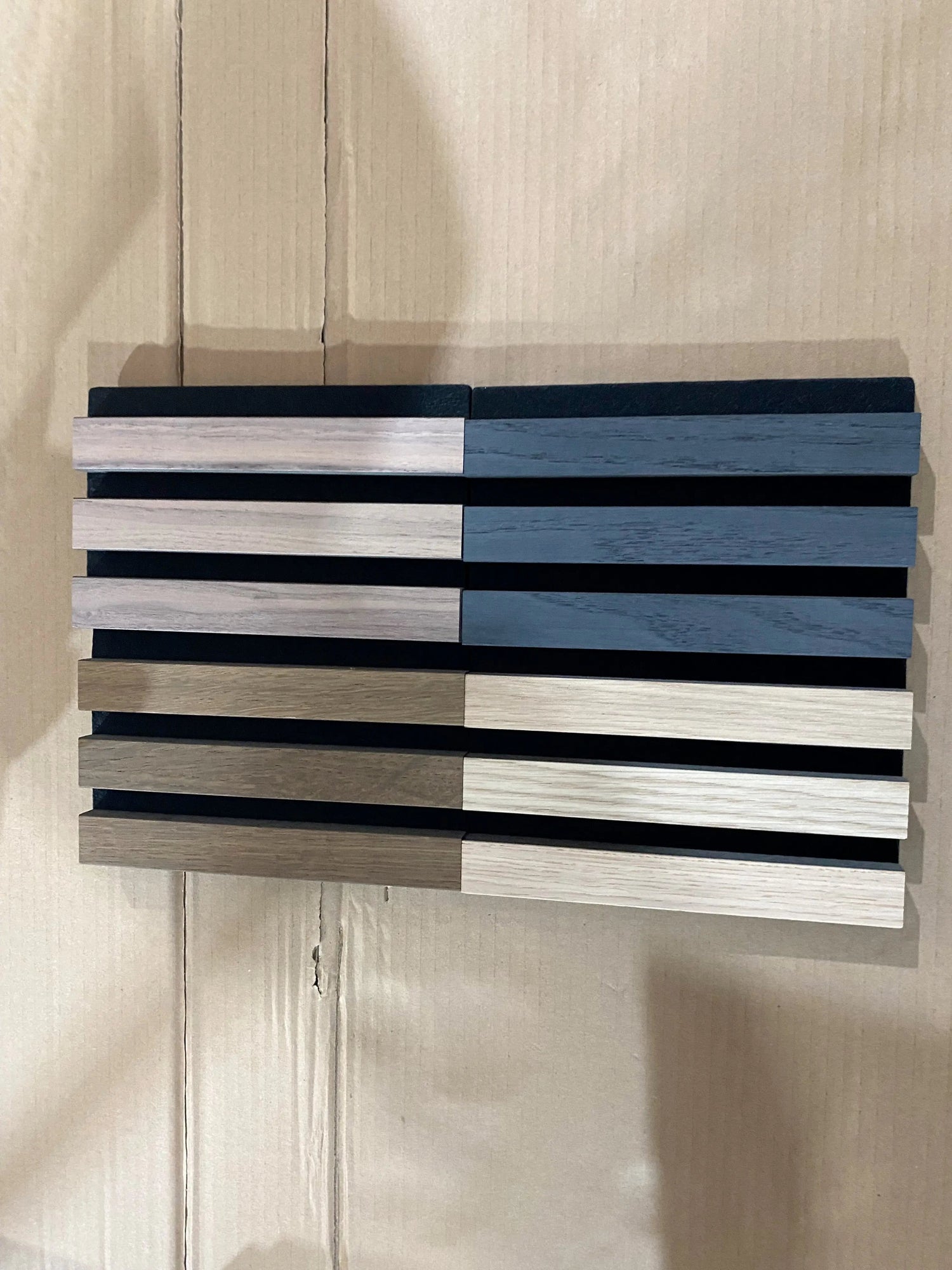 Our sample box offers a unique opportunity to see, feel and compare our Acoustic Slat Wood Panels in all five colors. Because the quality of the material and the color options are best appreciated in person, this sample box is an indispensable tool for interior designers, architects, and design enthusiasts. The keyword here is a 'sample box'. It not only allows you to appreciate the material's quality but also provides an accurate representation of color and texture.