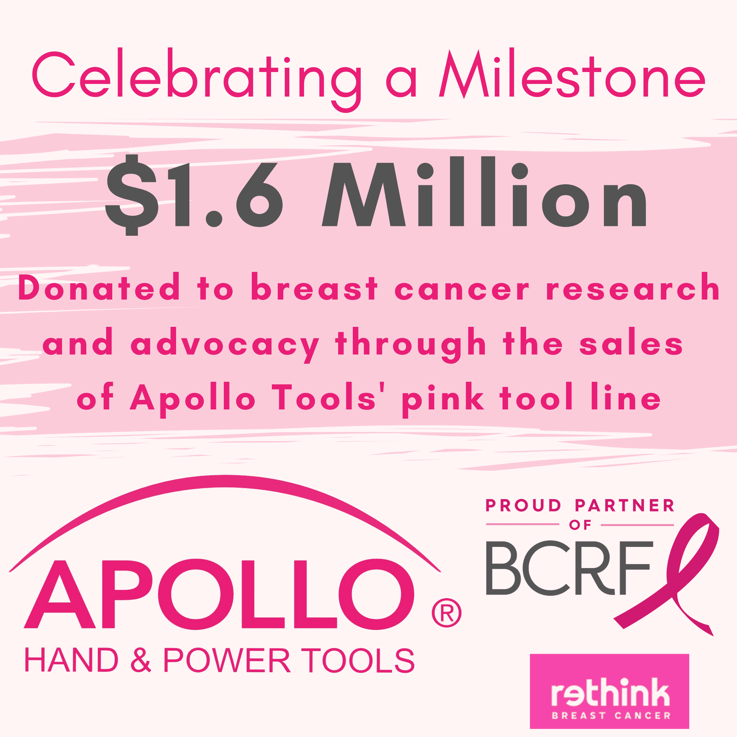 DONATION TO BREAST CANCER RESEARCH. Apollo Tools, Ltd is donating $0.25 from this purchase to the Breast Cancer Research Foundation®. BCRF’s mission is to advance the world’s most promising research to eradicate breast cancer. For more information about BCRF, visit bcrf.org. You can read more about Apollo Tools' breast cancer commitment here.