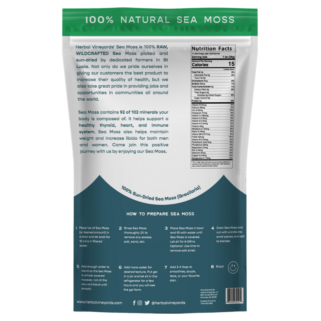 Herbal Vineyards’ raw sea moss is great in tea & other hot/cold beverages, smoothies, food, or alone! Feel free to get creative - as long as you consume it daily! On top of that, it contains protein, vitamin B, beta carotene, sulfur, pectin, and vitamin C.