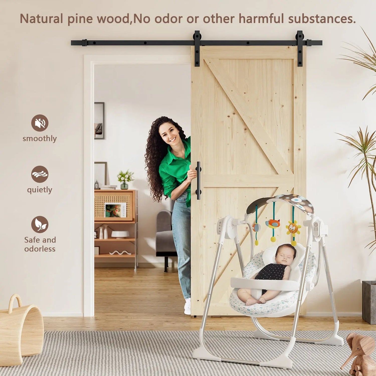 This barn door hardware kit is made of 100% natural premium solid pine, naturally rot-resistant, and has no odor. Greater resistance to warping, twisting, and splitting than other barn doors. Intelligent tongue and groove construction provides a durable and solid feel. Clear coating adds a sheen to the natural wood barn doors, perfect to show off the natural beauty of the wood barn door.