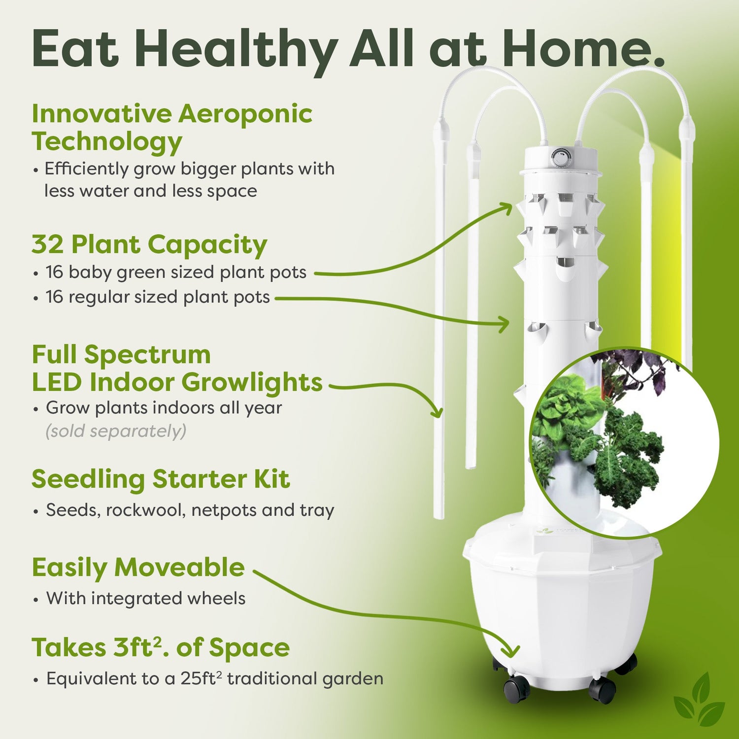 The Tower Garden HOME system allows you to easily grow your favorite fresh produce and herbs with a vertical, aeroponic garden built to grow year round in the comfort of your own home. This Tower Garden HOME system has everything you need to begin growing up to 32 plants immediately, in just under 3 square feet! Eating healthy just got a whole lot simpler. Looking to grow outdoors, too? The Tower Garden HOME is built to withstand the elements of the great outdoors.