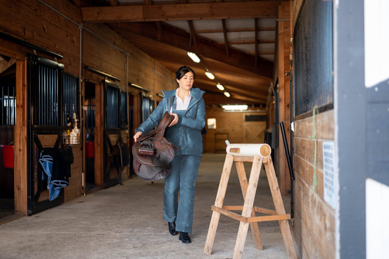 Our much-lauded insulated winter riding jacket is back in a second generation and ready to take on winter with you! It's lighter weight but just as warm, and the backpack straps have been upgraded to a sturdy but soft elastic. Our favorite features include the double ended zipper that allows for hip mobility in the tack, thumbholes to keep your hands warm, and an adjustable riding hood that fits over a helmet.