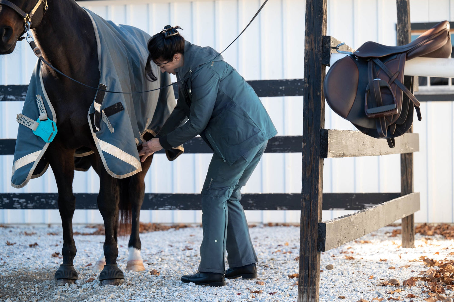- Back zipper can be opened to allow more flexibility when sitting in your tack, or can be closed to provide more warmth